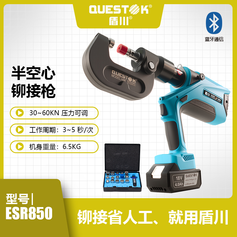 ESR850智能可调压半空心铆接枪,可精准调压,广泛应用于五金、板材行业、电缆桥架行业、汽车行业铆接,有动力强劲、压力可调、智能高效、便携等特点,内置智能芯片及精确的压力传感器,确保压力适中,可调可控。