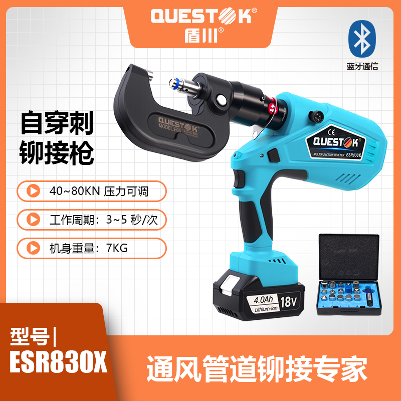 ESR830X智能可调压自穿刺铆接枪,可精准调压,广泛应用于五金、板材行业、电缆桥架行业、汽车行业铆接,有动力强劲、压力可调、智能高效、便携等特点,内置智能芯片及精确的压力传感器,确保压力适中,可调可控。