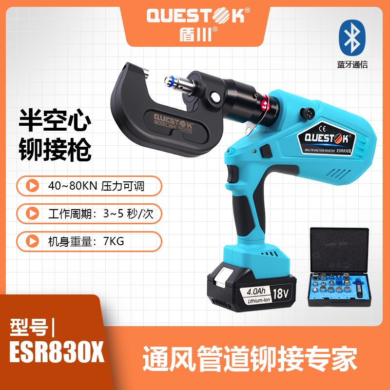 ESR830X智能可调压半空心铆接枪,可精准调压,广泛应用于五金、板材行业、电缆桥架行业、汽车行业铆接,有动力强劲、压力可调、智能高效、便携等特点,内置智能芯片及精确的压力传感器,确保压力适中,可调可控。