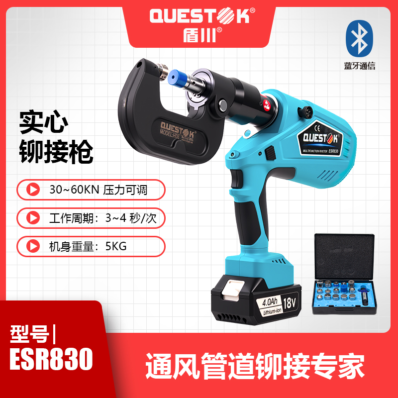 ESR830智能可调压实心铆接枪,可精准调压,广泛应用于五金、板材行业、电缆桥架行业、汽车行业铆接,有动力强劲、压力可调、智能高效、便携等特点,内置智能芯片及精确的压力传感器,确保压力适中,可调可控。