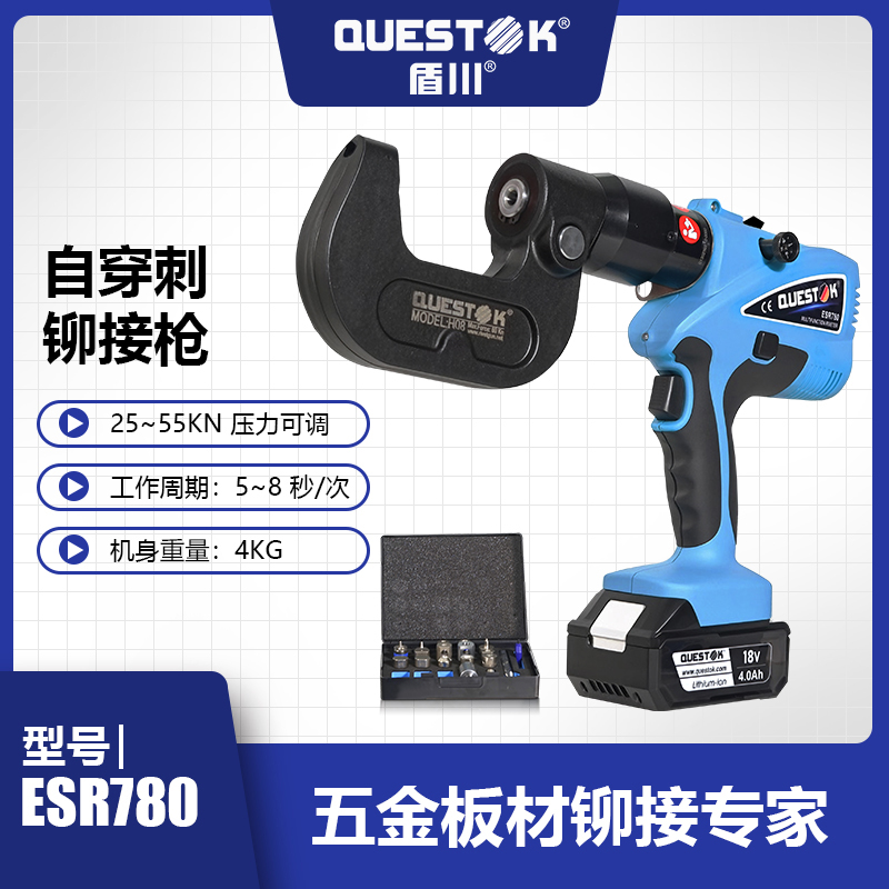 ESR780智能可调压自穿刺铆接枪,可精准调压,广泛应用于五金、板材行业、电缆桥架行业、汽车行业铆接,有动力强劲、压力可调、智能高效、便携等特点,内置智能芯片及精确的压力传感器,确保压力适中,可调可控。